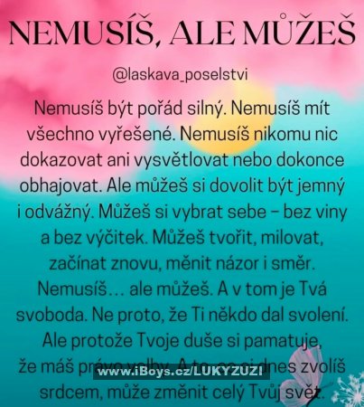 Mám střechu nad hlavou, vlastní rozum a život srovnaný tak, že mě nehoní minulost ani potřeba něco dokazovat. V ruce držím spíš nepopsaný papír než mobil, ale když má smysl napsat, napíšu. Když má smysl mlčet, mlčím. Umím naslouchat i říct věci přímo – bez masek a bez her.